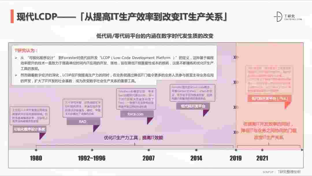2020年前后,,,,,,源于提高IT工作者开发效能的LCDP不断进化和衍生,,,,,,,,,,面对业务导向日益明显的数字化变革。。。。。。。。LCDP衍生出了面向不同对象的升级服务——面向专业人群的LCDP和业务人群的NCDP,,,,,,,LCDP与NCDP的不同服务属性被逐渐认可和接受。。。。。。。。。。。 LCDP在提高IT开发效率的同时,,,,,,,,降低IT与业务之间协同的门槛改变IT生产关系。。。。。。。。